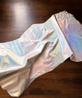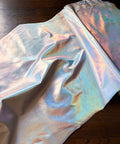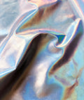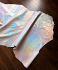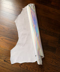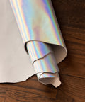 This cowhide features an iridescent metallic foil finish applied through the same heat-bonded process used on our metallic leather line, producing a reflective surface that shifts color depending on light and angle.